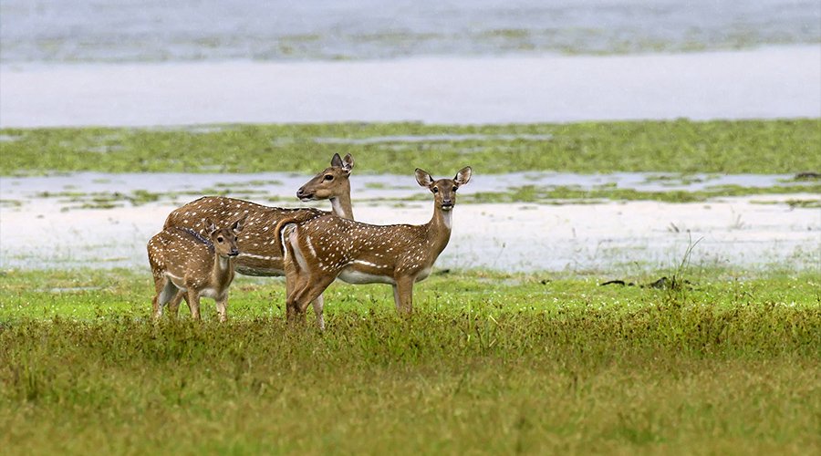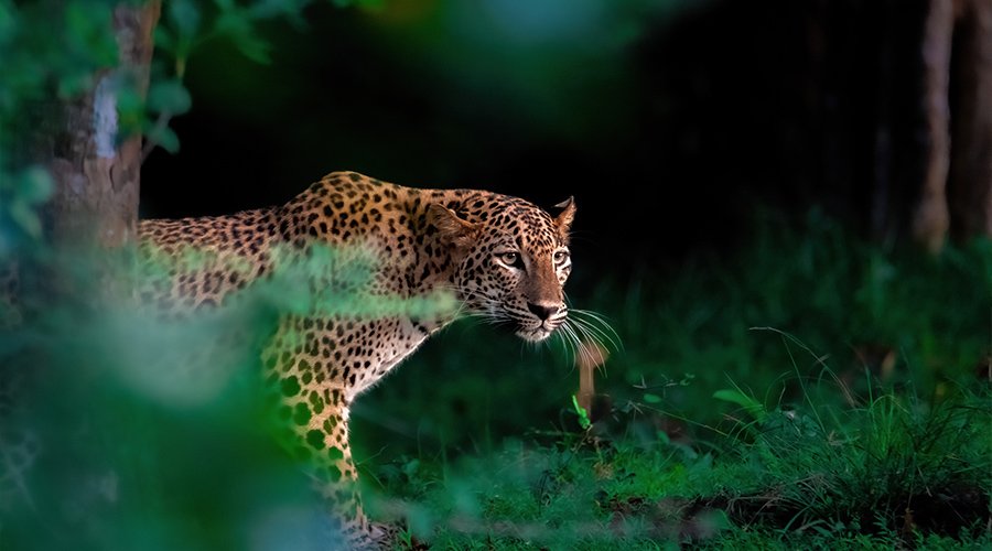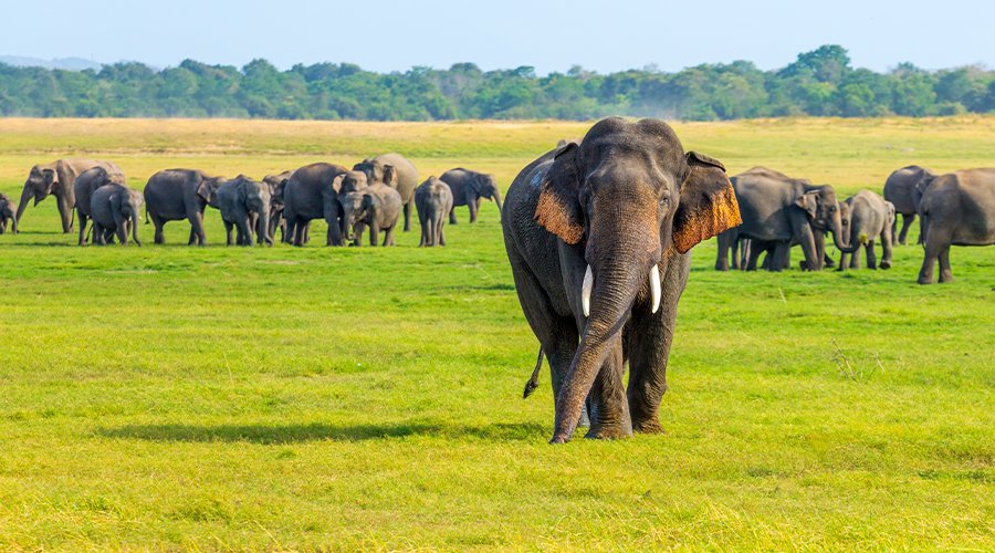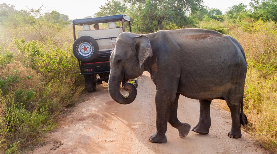 Yala National Park has open grasslands with predators like leopards and elephants. Birds and small animals are scattered. Wildlife is active but can be difficult to locate. Terrain is mostly flat with some scrub and forest. Visitors must stay in vehicles to safely view animals.